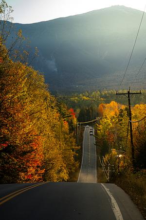 Mount Washington with a hint of snow and Cog Railway, Foliage in morning light
