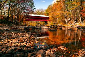 Peak Color with some mirroring of the covered bridge in the river with a long exposure shot
